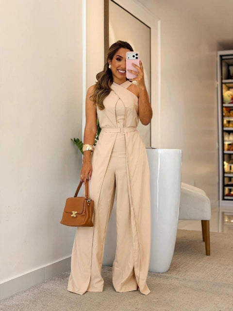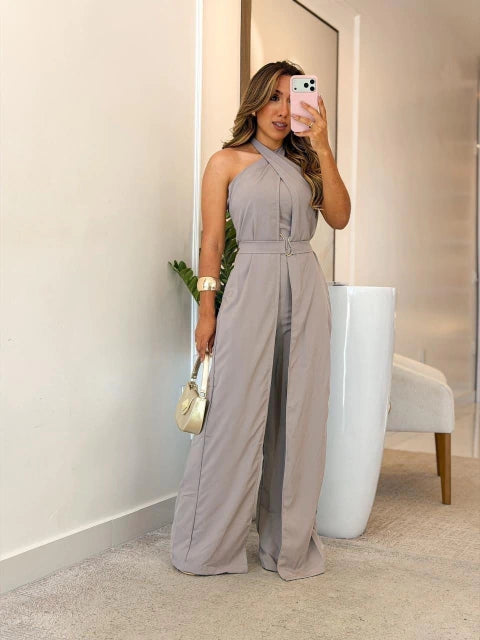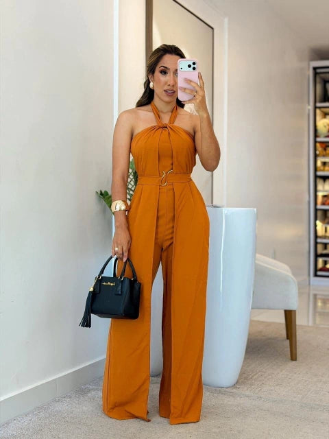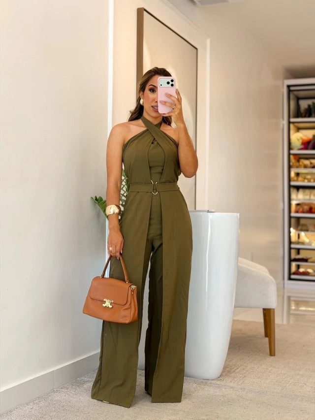Macacão longo com proposta elegante e contemporânea, ideal para mulheres que buscam sofisticação com praticidade. O modelo apresenta decote halter com amarração no pescoço, criando um visual moderno que valoriza o colo e os ombros. A parte superior possui recorte estruturado, enquanto a cintura bem marcada, acompanhada por cinto do próprio tecido com detalhe metálico, ajuda a definir a silhueta de forma equilibrada e feminina.